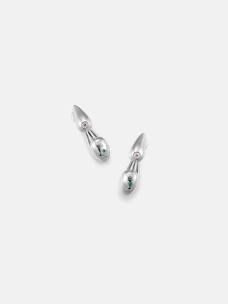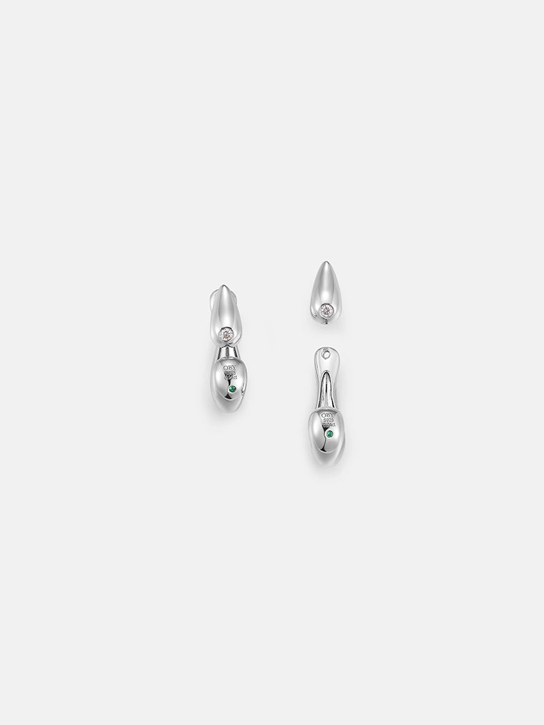 Crafted in high-polish Sterling Silver, the design features a two-part modular system. The primary stud showcases a solitary, flush-set diamond housed within a sleek teardrop silhouette. The detachable ear jacket curves seamlessly behind the lobe, extending the visual line to create a suspended, double-tier effect.This articulated design offers dual wearability: wear the diamond studs solo for understated daily elegance, or attach the sculptural jacket for a sophisticated, avant-garde statement.