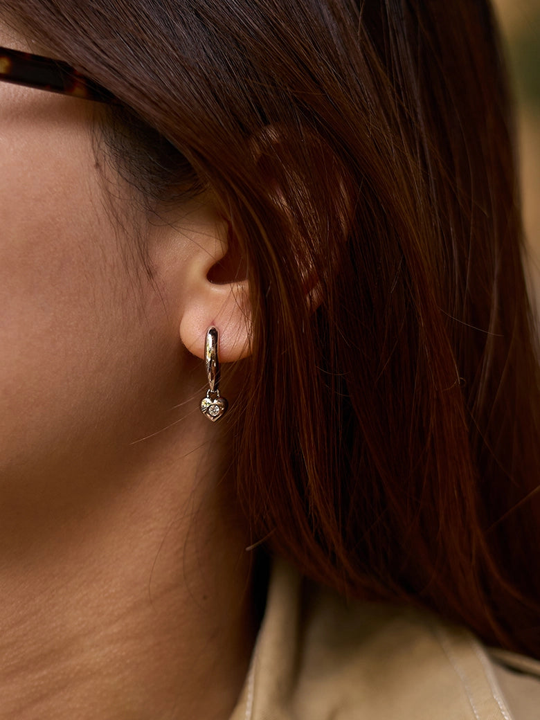 Expertly crafted in 925 Sterling Silver, each piece features a voluminous, puffed heart motif suspended from a classic seamless hoop. The drop element is engineered with a fully articulated bail, allowing the charm to oscillate freely with the wearer’s movement. A single round brilliant-cut diamond is bezel-set at the heart’s center, providing a precise focal point of brilliance against the mirror-polished silver surface.