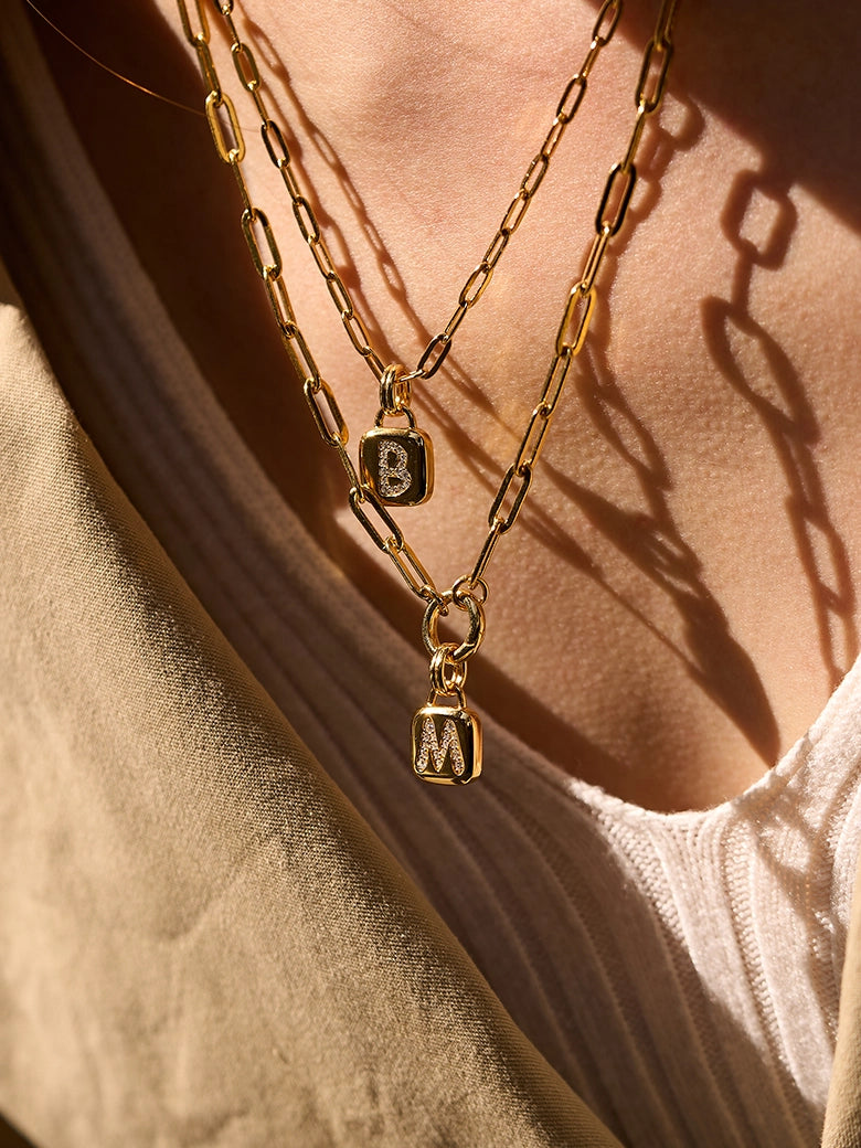 The Diamond Initial Tag Necklace is a contemporary take on personalization. The pendant features a modern, clean tag silhouette—a testament to minimalist sculpture—with beautifully rounded corners that offer a sense of natural flow.Suspended from a paperclip chain, this tag offers a sophisticated, yet subtly impactful, statement. It is a highly female-friendly piece, perfect for solo wear or for adding depth and personal meaning to a layered look.