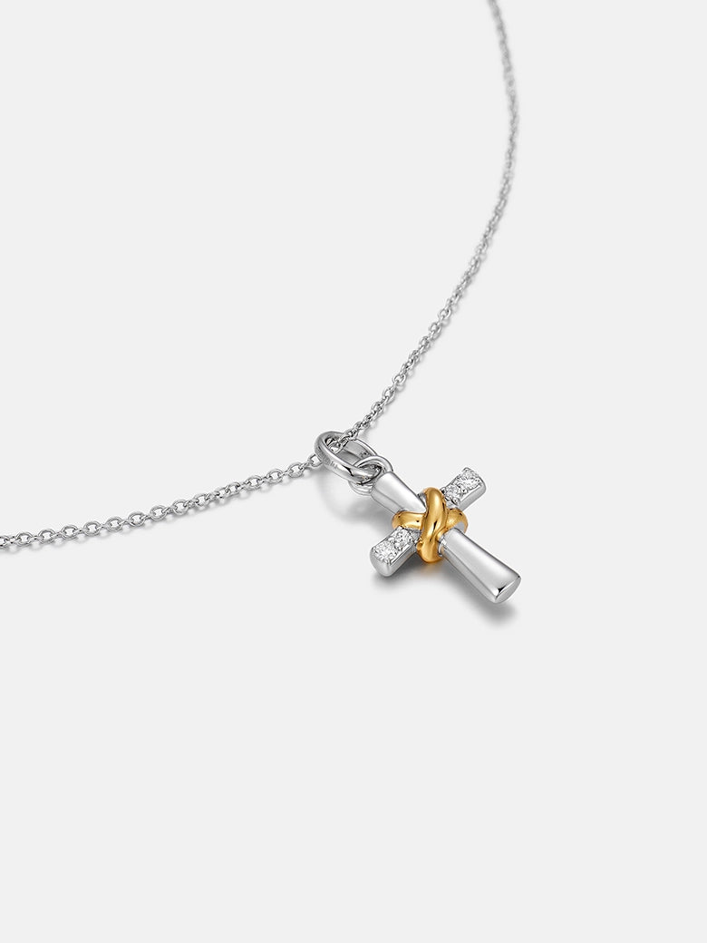 We’ve redefined the classic cross with a focus on structural tension. This isn't a single casting; it is a visual assembly of three distinct elements locked in perfect balance.A vertical bar of high-polish sterling silver provides the cool, sleek spine. It is intersected by a horizontal beam of pave-set diamonds, adding a precise line of fire. The defining moment is the 18K gold vermeil knot that wraps securely around the axis—interlocking the cold metal with warm luxury. It’s a modern symbol of a bond that holds fast.