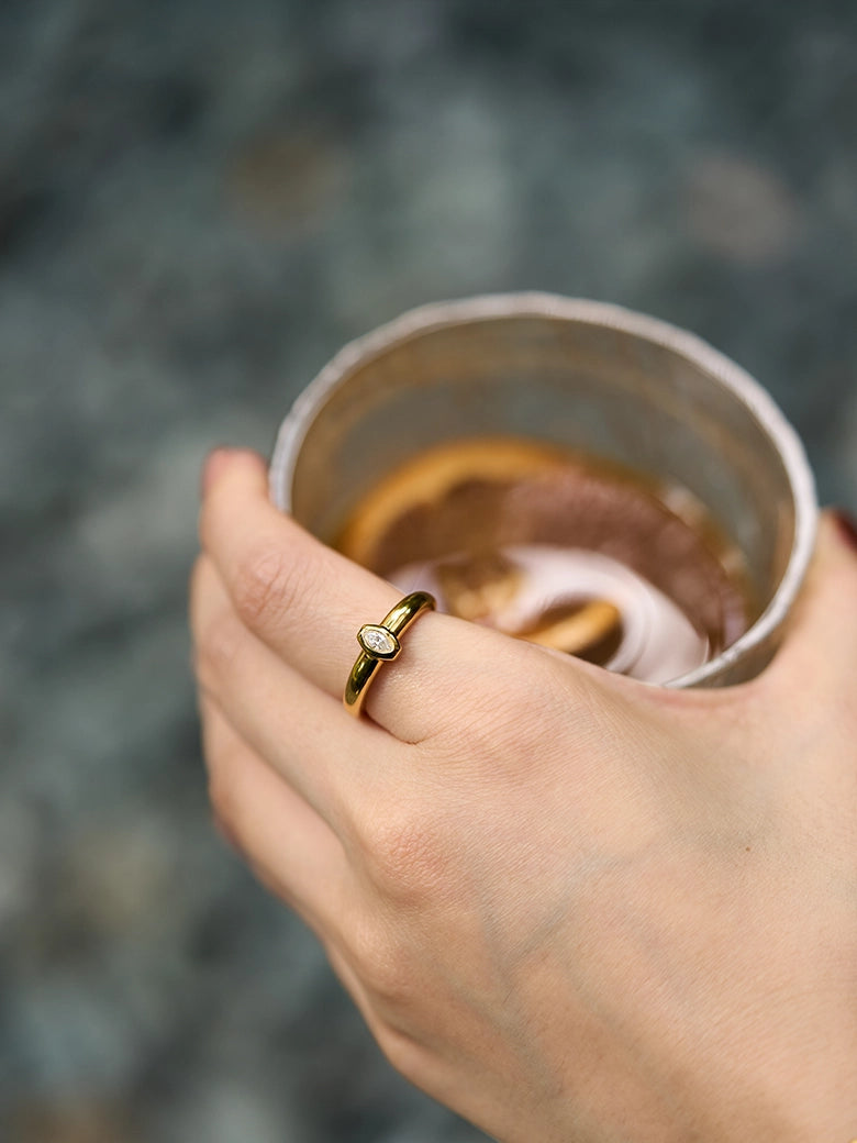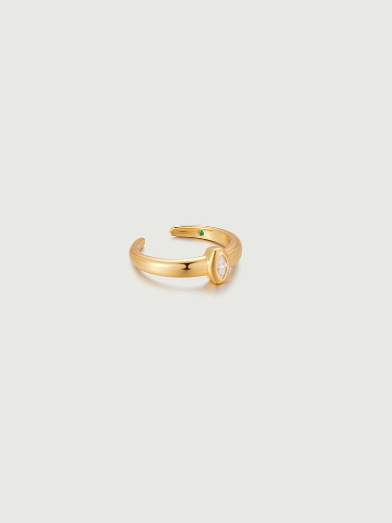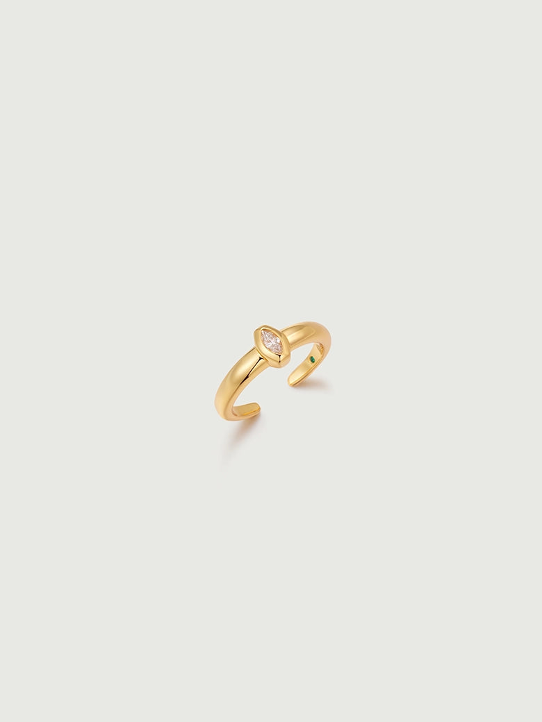 A sculptural study in balance, the liquid gold dome offers a heavy, lustrous embrace, while the sharp Marquise gem strikes with precision. Designed as your styling anchor, it commands presence without overpowering. This piece effortlessly transcends the ordinary, bridging the gap between the crisp lines of daytime tailoring and the soft drape of evening silk.