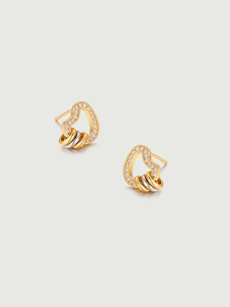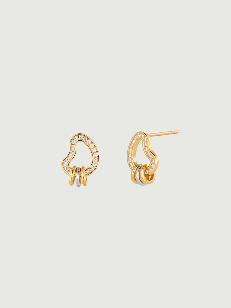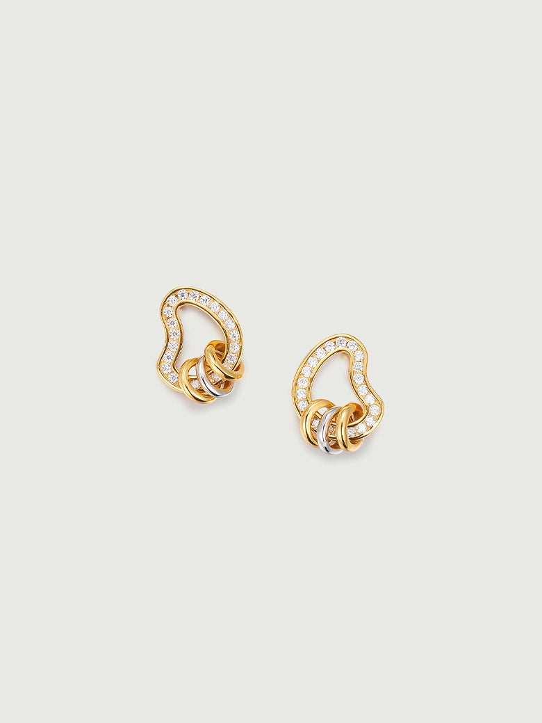 Defined by a striking, organic pebble shape, these studs feature a brilliant pavé of Moissanite stones. The design is grounded by a trio of interlocking, fluid rings that introduce a subtle, luxurious mixed-metal dimension. Its sculptural form and balanced brilliance offer an everyday statement that is both artful and highly wearable.