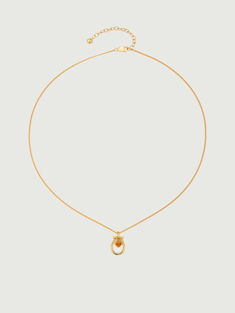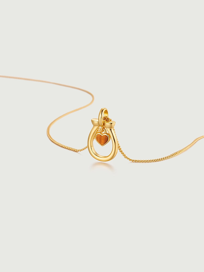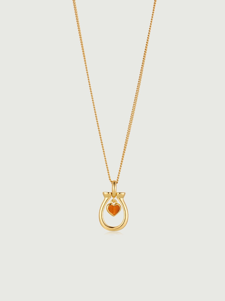 Tiger's Eye Horseshoe Charm Necklace. What makes this piece special is the articulated suspension. The heart isn't soldered shut; it swings freely within the gold frame, catching the light to reveal the stone's silky, natural chatoyancy. It’s an everyday shield designed to move with you.