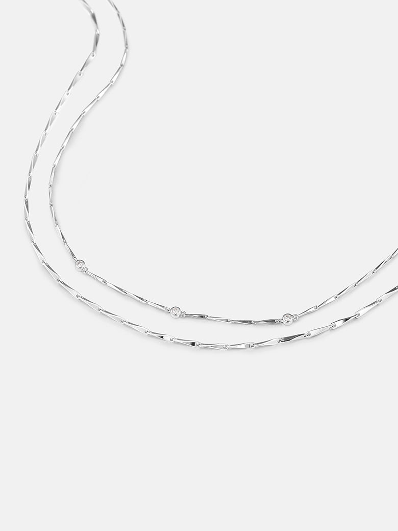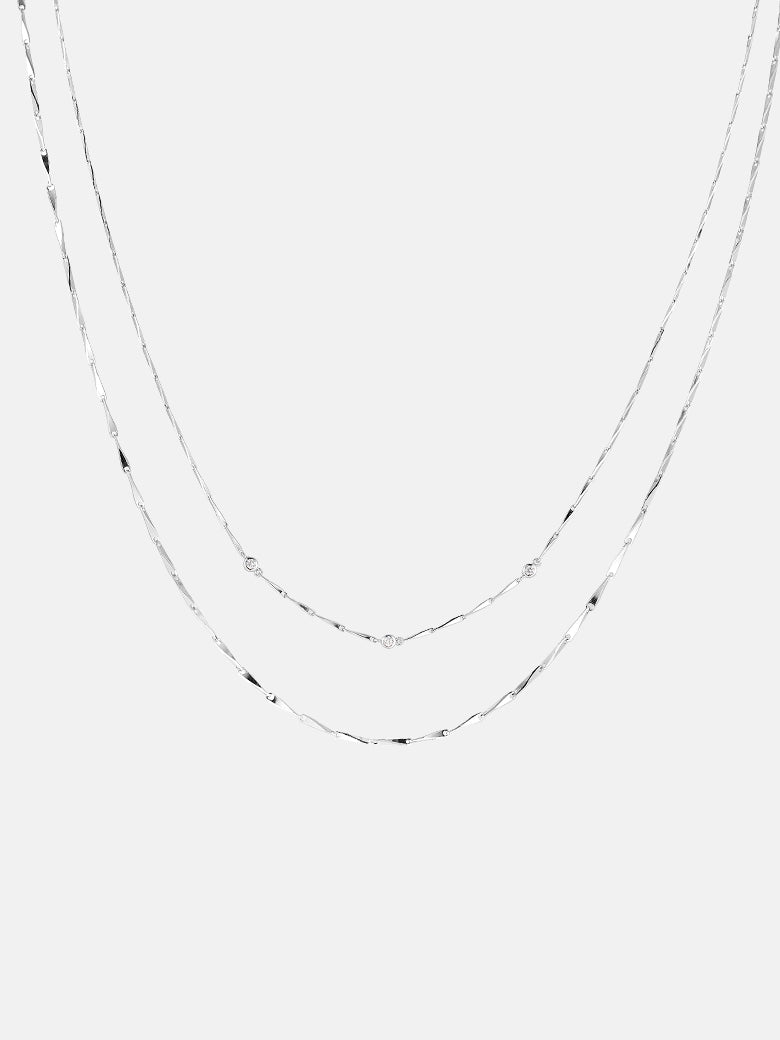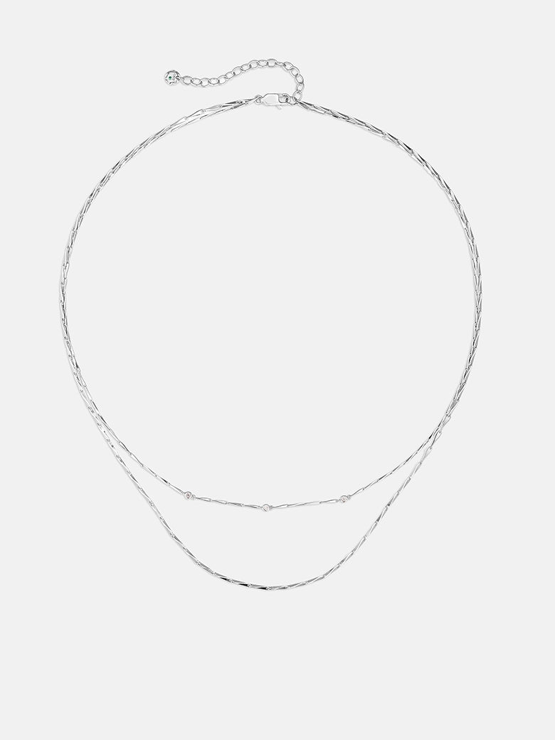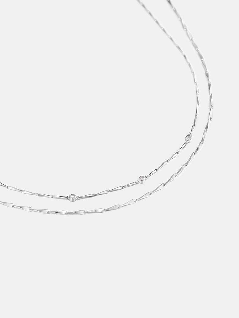A sleek Sterling Silver Bar-Link chain that drapes slightly lower. Its high-polished, elongated bars reflect light in linear flashes, providing a geometric counterpoint to the round stones above.
